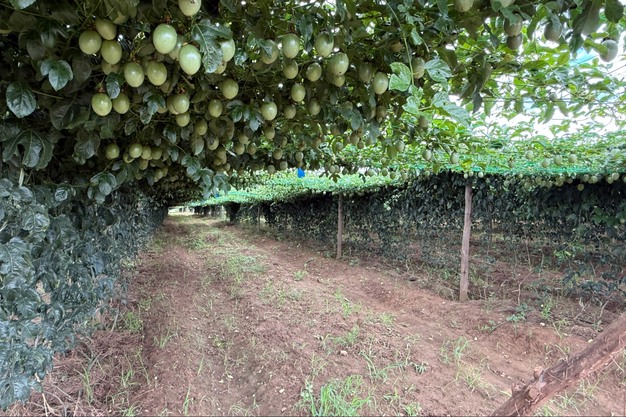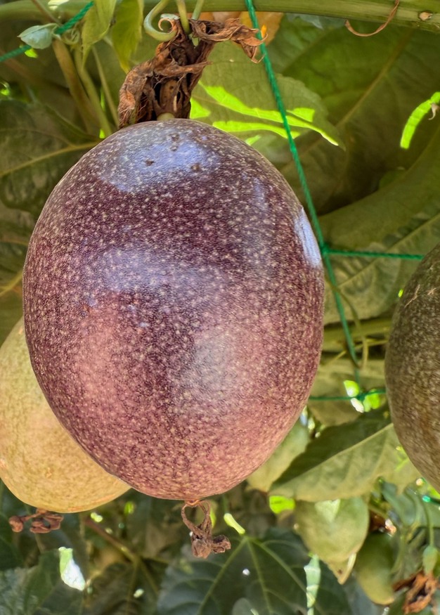 De ster van het veld is Ester, een passiefruitras geïmporteerd uit Zuid-Afrika. Paars van buiten, geel van binnen. Dankzij druppelirrigatie levert deze variëteit tot wel 20 ton per hectare op en is hij bijna het hele jaar door te oogsten. "Binnen negen maanden na aanplant heb je opbrengst. Perfect als startgewas", zegt Jesse.
