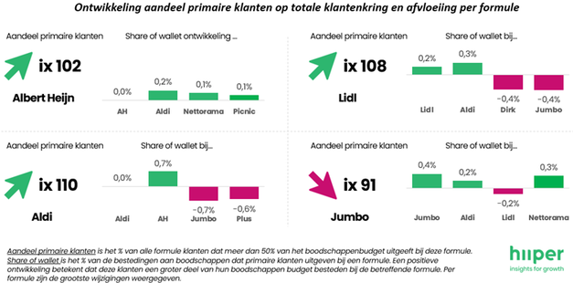 Leeswijzer: Het aandeel van primaire klanten binnen de totale klantenkring van Aldi is met 10% (index 110) gegroeid tov 2024, terwijl de share of wallet van primaire klanten bij Aldi zelf gelijk gebleven is (0,0%-pt). Wel geven Aldi primaire klanten minder uit bij zowel Jumbo (-0,7%-pt) als Plus (-0,6%-pt)