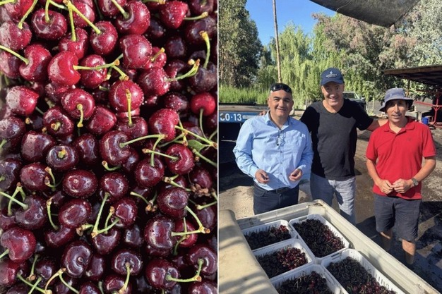 Links: Vers geoogste kersen van Chileense teelt. Rechts: Hans Widmann (m) bezocht de oorsprong aan het begin van de oogst midden december.