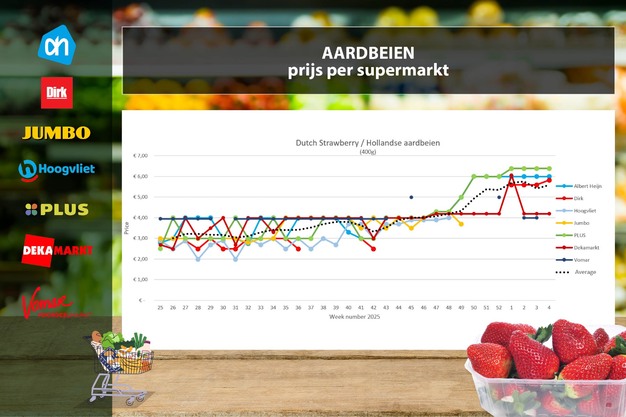 Voor de aardbeienprijs kunnen we geen zuivere vergelijking bieden. Sinds week 1 van 2026 is het alleen Albert Heijn die (online) een 400g Hollandse aardbeienvariant aanbiedt en de prijs blijft 5,99 euro voor een bak van 400 gram. De andere supermarkten die aardbeien voeren, hebben alleen nog een 250g variant. Deze aanbiedingen worden nu omgerekend naar 400 gram. De prijs bij Dirk stijgt dan met 23 eurocent. De gemiddelde weekprijs komt uit op 5,75 euro.