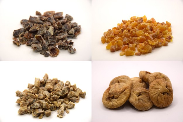 Vanaf linksboven met de klok mee: dadelstukjes, abrikozenstukjes, vijgen en vijgenstukjes