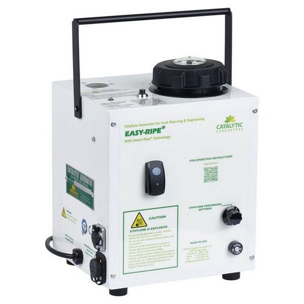 Onder de getoonde rijpingsoplossingen zijn katalytische ethyleengeneratoren van FPI's partner Catalytic Generators. Deze systemen produceren ethyleen direct in de rijpingskamers, zonder dat samengeperst gas hoeft te worden opgeslagen of gehanteerd. Eén generator is geschikt voor ruimtes van 57 m³ tot 300 m³ en kan in goed afgesloten kamers grotere volumes bedienen. De compacte en lichte units kunnen tussen kamers worden verplaatst, waardoor niet voor elke kamer een vaste generator nodig is. De gecontroleerde ethyleenafgifte ondersteunt het natuurlijke rijpingsproces en draagt bij aan uniforme kleuring en rijpheid, vooral bij bananen en avocado's.