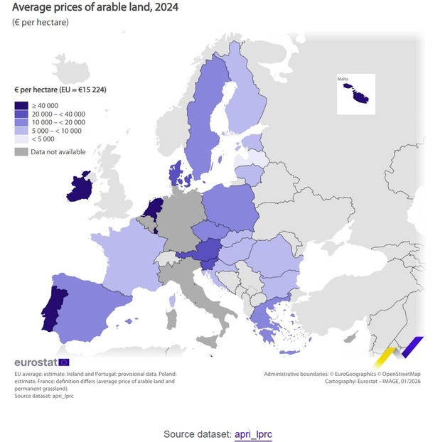 De grondprijzen varieerden sterk tussen de lidstaten waar gegevens beschikbaar zijn. Malta noteerde de hoogste gemiddelde prijs voor landbouwgrond met €201.263 per hectare, gevolgd door Nederland (€96.608) en Portugal (€76.556 per hectare).