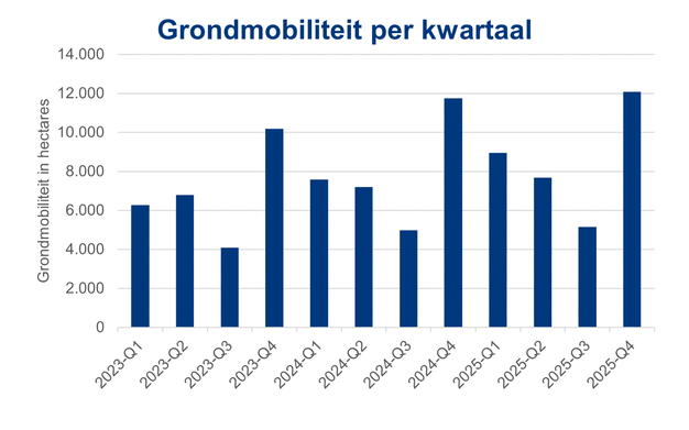 In het 4e kwartaal is 12.100 ha landbouwgrond verhandeld. Dat is bijna 330 ha of 2,8% meer dan in hetzelfde kwartaal van 2024. In heel 2025 is 33.900 ha grond verhandeld. Dat is 7,4% meer dan in 2024, toen 32.500 ha werd overgedragen