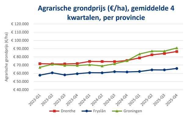 In de provincies Fryslân, Drenthe en Groningen is de gemiddelde agrarische grondprijs in het 4e kwartaal met 2,8%, 2,9% en 4,4% gestegen.
