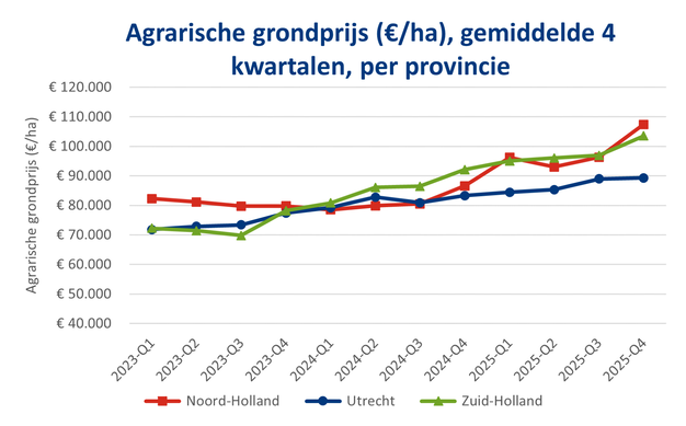 De prijs van agrarische grond in Nederland is in het 4e kwartaal van 2025 sterk gestegen. De prijs ging in 1 kwartaal omhoog met 12,7%. Dat is van € 92.900 in het 3e kwartaal naar € 104.700 per hectare (ha) in het 4e kwartaal. Over heel 2025 kwam de gemiddelde grondprijs uit op € 95.400 per ha. Dat is 11,8% hoger dan in 2024. In dat jaar was de prijs € 85.300 per ha.