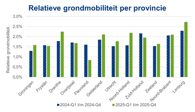 De relatieve grondmobiliteit varieert in 2025 van 0,85% in Flevoland tot 2,73% in Limburg. In vergelijking met 1 jaar eerder is de relatieve grondmobiliteit het sterkst gedaald in Flevoland en Zuid-Holland met 0,8 en 0,2 procentpunt. En het sterkst gestegen in Noord-Holland en Drenthe met 0,6 en 0,5 procentpunt.