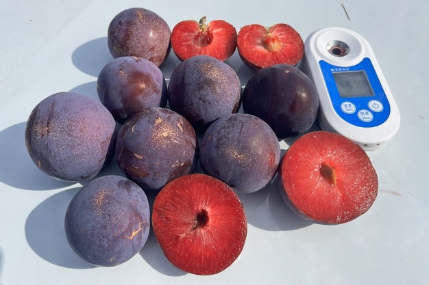 Pallatina (K321-75), een Japanse pruim met rood vruchtvlees, geplukt in Frankrijk op 20 juli 2025