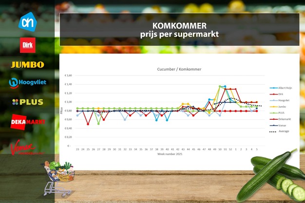 Na de aanbieding in week 4 verlaagt Hoogvliet de prijs van komkommer. Deze liggen voor 85 eurocent per stuk in het onlineschap. Bij de andere onderzochte supermarkten zijn geen veranderingen ten opzichte van week 4. Vomar heeft weer komkommers in het online assortiment. Net als bij Hoogvliet kosten ze 85 eurocent per stuk. De gemiddelde weekprijs blijft gelijk: 91 cent.