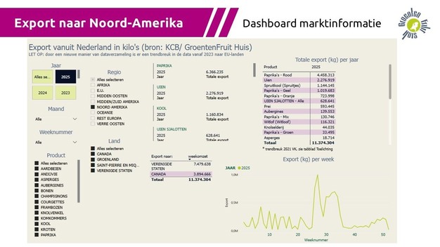 Het dashboard van GroentenFruit Huis biedt gedetailleerde marktinformatie van productie tot consumptie. Leden van de organisatie kunnen dit instrument gebruiken om trends en kansen in exportmarkten te volgen.