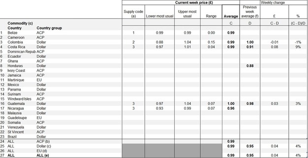Guatemala liet een laagst gebruikelijke prijs van £0,97 (€1,12) en een hoogst gebruikelijke prijs van £1,04 (€1,20) zien, met een prijsvork van £0,07 (€0,08). Het gemiddelde steeg naar £1,00 (€1,15) van £0,98 (€1,13), wat een week-op-week stijging van £0,03 (€0,03) of 3% betekent.