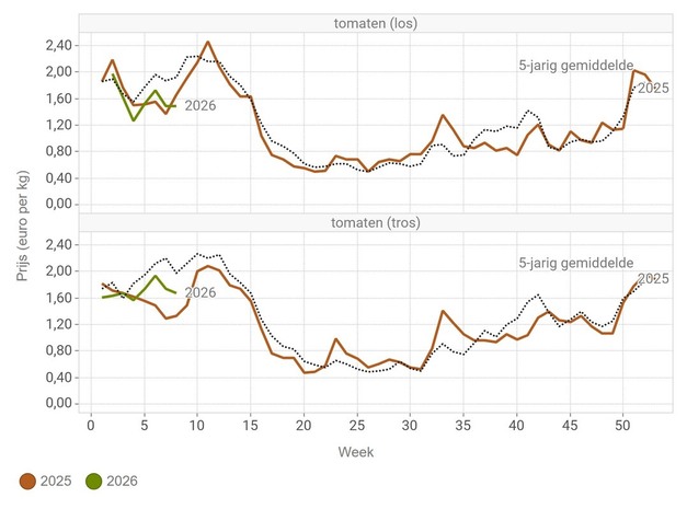 Met in veel gevallen gevoelig lagere volumes liggen de middenprijzen bij de veilingen van het Verbond van Belgische Tuinbouwcoöperaties in week 8 dikwijls een stuk hoger dan een jaar eerder. Een uitzondering zijn de tomaten, waar de volumes wel hoger liggen dan een jaar eerder, met desondanks voor trostomaten een hogere middenprijs van 1,67 euro per kilo. Losse tomaten doen 1,49 euro per kilo, een lagere prijs dan een jaar geleden.
