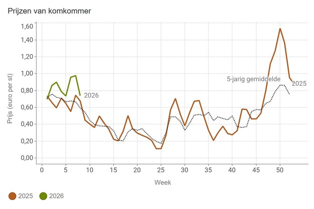 De komkommerprijs is nog altijd hoger dan een jaar eerder, maar niet meer zo hoog als in week 7. De gemiddelde stuksprijs in week 8 komt uit op 74 eurocent.