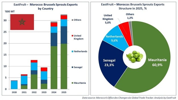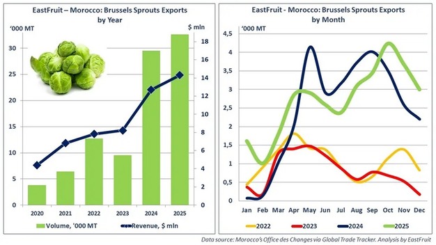Marokko behoort hiermee tot de top drie spruitenexporteurs wereldwijd, na Mexico en Nederland. Leveringen vinden jaarrond plaats, met seizoenspieken in lente en herfst. Van maart tot juni is de export vooral gericht op Europa, waar Marokko de markt bevoorraadt, terwijl van augustus tot december de meeste volumes bestemd zijn voor West-Afrikaanse markten.