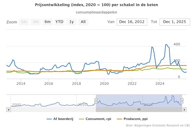 De prijsindex af boerderij (API) voor aardappelen, die de prijzen weerspiegelt die telers krijgen, is in november 2025 gedaald naar 76 punten (2020 = 100). Dat is een daling van circa 13% ten opzichte van september 2025 en maar liefst 58% lager dan in november 2024. Dit is het laagste niveau sinds begin 2021 en volgt op uitzonderlijk hoge af-boerderijprijzen in de voorafgaande jaren, zo blijkt uit de voedselprijzenmonitor van Agrimatie.
