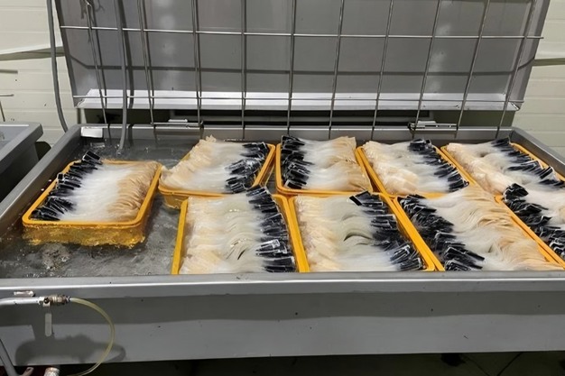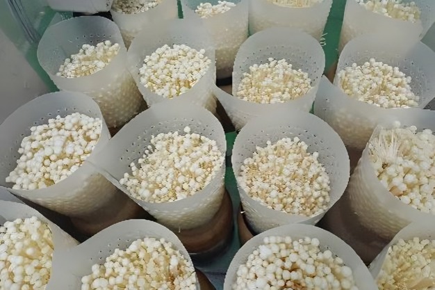 "We gebruiken een gecontroleerd flessenteeltsysteem dat bestaat uit substraatvoorbereiding, sterilisatie, inoculatie, incubatie, vruchtvorming en oogst. Exportvolumes vereisen extra sorterings- en verpakkingsnormen. De vijf sleutelfasen zijn: substraatvoorbereiding (op basis van zaagsel en voedingsstoffen) en flesvulling; sterilisatie en afkoeling om besmetting te reduceren en de juiste inoculatietemperatuur te bereiken. Daarna volgt inoculatie met broed en de incubatie (myceliumgroei), gevolgd door vruchtvorming met nauwkeurige temperatuur-/vochtigheid-/CO₂-controle. Het omgevingsbeheer heeft immers een significante invloed op de kwaliteit van enoki. Uiteindelijk is het tijd voor oogsten, sorteren en verpakken, waarna de distributie in de koude keten begint."