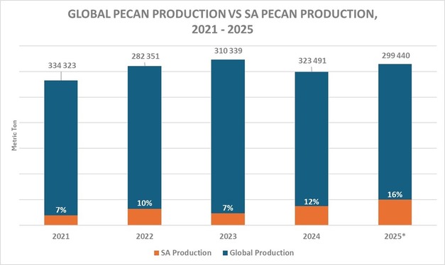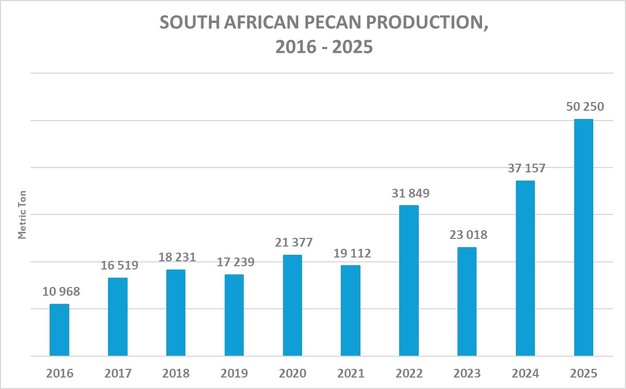 "Met de groeiende volumes zijn we actief op zoek naar nieuwe markten voor Zuid-Afrikaanse pecannoten," zegt Cobus van Rensburg, algemeen manager van SAPPA. "We verwachten dit jaar een oogst tussen de 52.000 en 55.000 ton, en er zijn nog veel jonge bomen die nog geen noten produceren. We voorzien een toename in het volume tot 2030 en daarna."