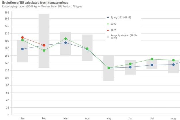 De middenprijs voor trostomaten in Nederland en Spanje bleef in februari achter bij het vijfjarig gemiddelde. Dat blijkt uit een update van het tomatendashboard van de Europese Commissie. Met gemiddeld 1,76 euro per kilo voor Nederlandse trostomaten ligt de prijs 9% lager dan het gemiddelde. De Spaanse gemiddelde kiloprijs ligt 11% lager en komt volgens de statistici uit op 1,08 euro per kilo.