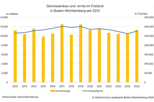 Volgens het Statistische Landesamt hebben teeltbedrijven in Baden-Württemberg in 2025 ongeveer 44.000 ton witte kool en 10.500 ton rode kool geoogst. Zowel het volume witte kool (+8%) als dat van rode kool (+13%) lag daarmee duidelijk boven het tienjarig gemiddelde voor de periode 2015-2024. Hoewel het areaal op een gemiddeld niveau lag, waren de opbrengsten per hectare bovengemiddeld.