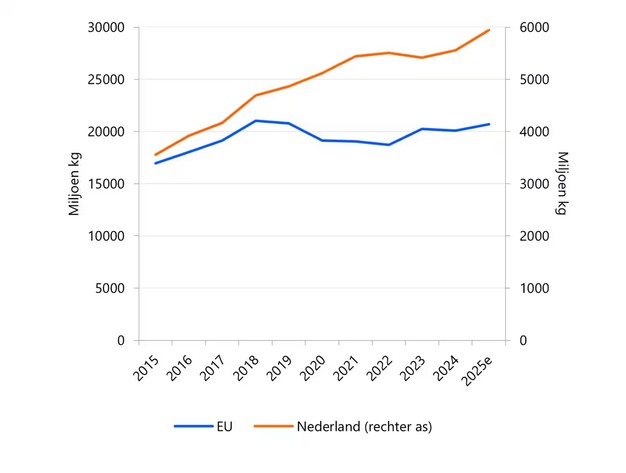 In Nederland stagneert de productie van groente en fruit na jaren van groei (zie figuur 5). In de EU neemt de productie zelfs af (zie figuur 6). Hoewel de import van groente en fruit door de EU naar verwachting blijft groeien, verwachten we ook hier meer schommelingen op productniveau. Oorzaken van de grotere langetermijn-onzekerheid in de beschikbaarheid van groente en fruit zijn onder andere klimaatverandering, strengere regels rond het gebruik van gewasbescherming, watertekorten, arbeidstekorten en gebrek aan opvolgers bij teeltbedrijven, geopolitieke spanningen en logistieke verstoringen.