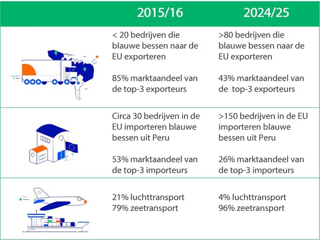 Door de sterke groei in populariteit van onder andere avocado's, blauwe bessen, mango en gember zijn nieuwe bedrijven actief geworden in de invoer van deze productstromen. Het aantal bedrijven in de EU dat blauwe bessen uit Peru importeert steeg bijvoorbeeld van 30 in 2015 naar meer dan 150 in 2025 (zie figuur 4). Dankzij het grote AGF-cluster en de sterke positie van de Rotterdams haven heeft Nederland kunnen profiteren van de snelle groei van het zeetransport van een aantal groente- en fruitsoorten. Onder de Nederlandse importeurs bevinden zich niet alleen bestaande en nieuwe Nederlandse importeurs, maar ook diverse verkoopkantoren van exporteurs uit Peru, Chili, Zuid-Afrika en andere overzeese landen.