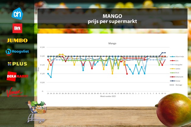 De gemiddelde mango-prijs stijgt in week 11 met 4 cent naar 1,96 euro per stuk. Deze stijging is volledig toe te schrijven aan Dirk, waar de promotie is afgelopen: de prijs gaat daar van 1,49 terug naar 1,79 euro. Alle andere supermarkten handhaven hun prijzen van week 10: Albert Heijn 1,99 euro, Hoogvliet 1,79 euro, Jumbo 1,99 euro, Plus 1,99 euro, DekaMarkt 1,99 euro en Vomar 2,19 euro.