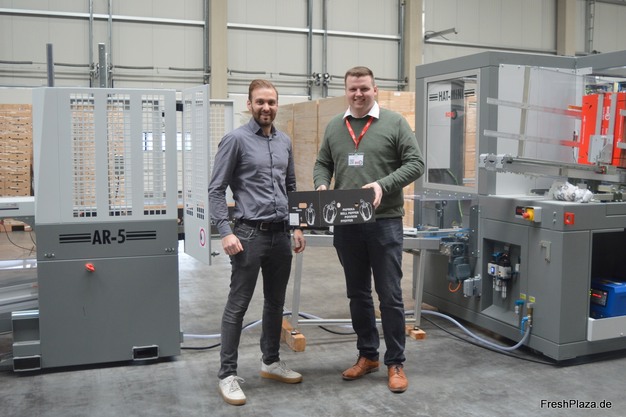 Jannick van Helden (sales Boix Germany) en Jonas Löffler van Prima Verpackung uit het Duitse Diemelstadt, producent van de kartonnen dozen voor o.a. vruchtgroenten.
