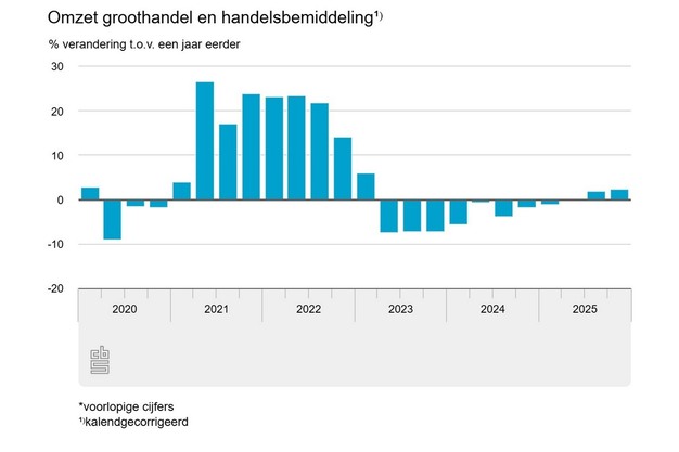 De omzet in de groothandel en handelsbemiddeling is in 2025 licht gestegen met 0,9 procent ten opzichte van 2024. In het vierde kwartaal lag de omzet zelfs 2,5 procent hoger dan in hetzelfde kwartaal een jaar eerder, waarmee voor het derde kwartaal op rij sprake is van groei. Dit blijkt uit recente cijfers van het Centraal Bureau voor de Statistiek over de sector.