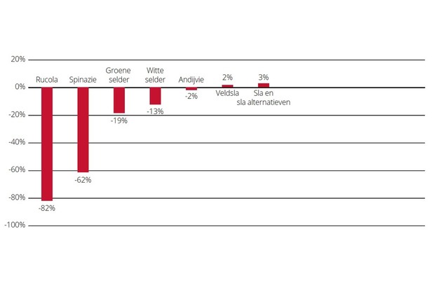 De dalende trend bij serrebladgroenten zet zich voort. Steeds meer telers stoppen met de teelt of kiezen voor een verminderd areaal, waardoor rucola (-82%) en spinazie (-62%) fors krimpen. Veldsla en kropsla laten echter een lichte stijging zien, respectievelijk +2% en +3%. De grondloze teelt van sla blijft stabiel, terwijl de traditionele grondteelt licht toeneemt, mede door het afstoten van ronden door enkele telers.