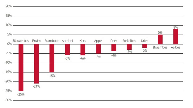 Bij fruit blijft de afname van arealen zichtbaar, maar deze wordt bepaald door meerjarige karakteristieken van de teelten. Hardfruit zoals appel en peer krimpt respectievelijk met 5% en 4%, met een aandeel van clubrassen van 16% bij appel en slechts 3% bij peer. Steenfruit daalt met 6%, waarbij krieken, kers en pruim respectievelijk 2%, 6% en 21% inkrimpen. Aardbeien dalen in 2026 met 6%, terwijl doordragende rassen nu 42% van het totale areaal uitmaken. Zachtfruit krimpt eveneens met 6%, met uitzondering van braam (+5%) en rode bes (+8%), terwijl blauwe bessen en frambozen het zwaar te verduren krijgen door prijsdruk.