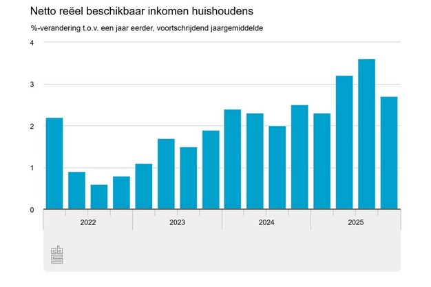 Het reëel beschikbare inkomen van huishoudens is in 2025 met 2,7 procent gegroeid ten opzichte van een jaar eerder. De toename is vooral toe te schrijven aan een stijging van de beloning van werknemers, door hogere cao-lonen. De hypotheekschuld groeide met 48,1 miljard euro ten opzichte van een jaar eerder, naar 935,9 miljard euro. Dit meldt het Centraal Bureau voor de Statistiek op basis van nieuwe cijfers over de financiën van huishoudens.