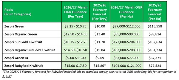 Zespri heeft zijn eerste richtlijnen voor telers voor het seizoen 2026/27 vrijgegeven, waarmee een vroege indicatie wordt gegeven van de verwachte opbrengsten nu het nieuwe seizoen van start gaat.