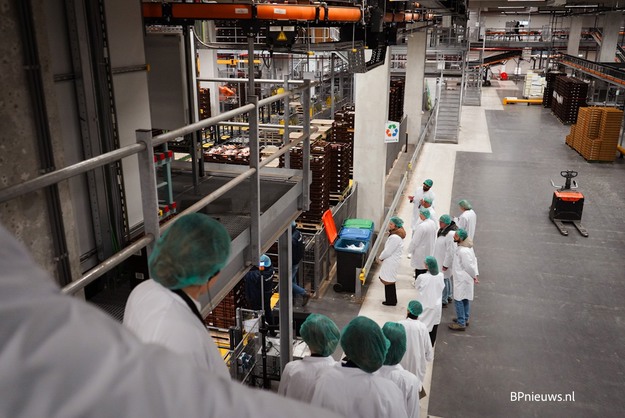 We lopen langs het schoonmaken, snijden, verpakken en inkratten. Alles strak georganiseerd en grotendeels gemechaniseerd. Bij de pickstations en kwaliteitscontroles vliegen de kratten je om de oren. Het absolute hoogtepunt is de 22 meter hoge opslag, waar kranen razendsnel producten verplaatsen – "een soort Walibi", klinkt het lachend in de groep.