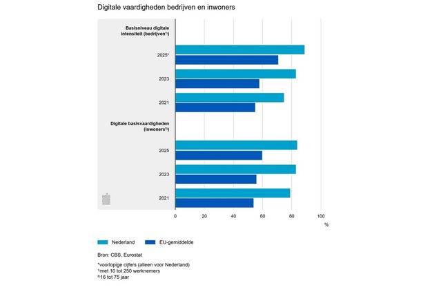 Nederland behoort tot de koplopers in Europa op het gebied van digitalisering. Volgens cijfers van het Centraal Bureau voor de Statistiek en Eurostat heeft in 2025 89% van de bedrijven (10–250 werknemers) het basisniveau van digitale intensiteit bereikt, tegen 83% in 2023. Daarmee komt de EU-doelstelling van 90% in 2030 in zicht.