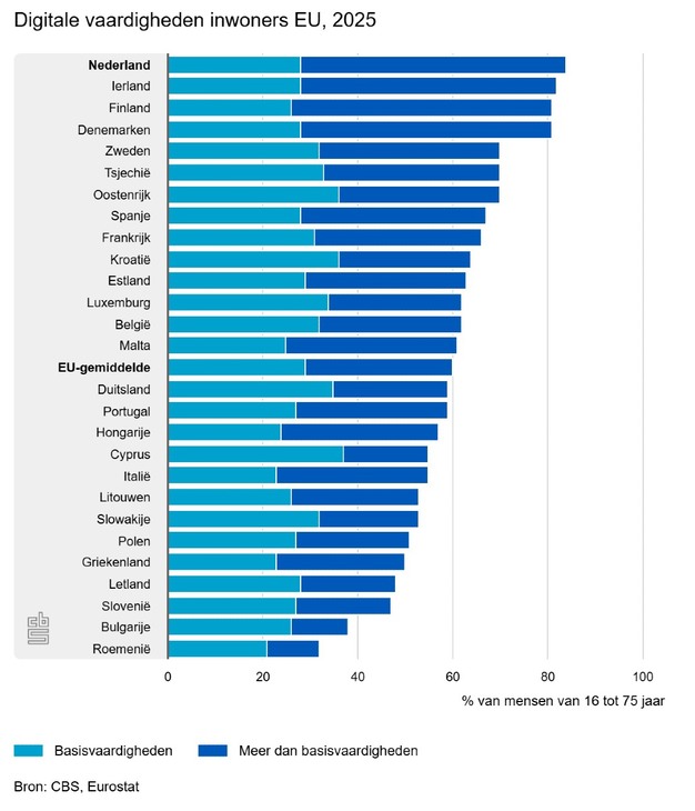 Ook inwoners scoren bovengemiddeld: 84% van de Nederlanders beschikt over ten minste digitale basisvaardigheden, het hoogste percentage binnen de EU en ruim boven het EU-gemiddelde van 60%. Bovendien heeft 56% meer dan basisvaardigheden, een duidelijke stijging ten opzichte van eerdere jaren.
