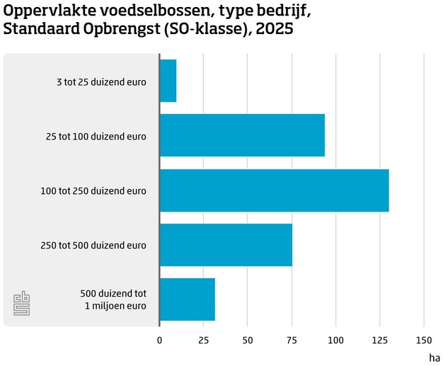 Ook de grootte van bedrijven speelt een rol. Kleine bedrijven met een standaardopbrengst van 25.000 tot 100.000 euro hebben het vaakst een voedselbos; 89 van deze bedrijven beheren samen 94 hectare. Bedrijven met een standaardopbrengst tussen 100.000 en 250.000 euro hebben het grootste totale areaal: 45 bedrijven beheren bijna 130 hectare. De kleinste voedselbossen liggen bij zeer kleine bedrijven met een standaardopbrengst tussen 3.000 en 25.000 euro, gemiddeld 0,4 hectare.