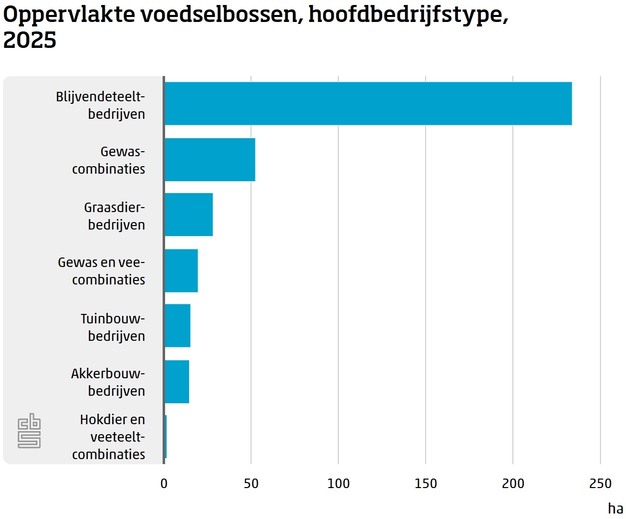 Het aantal voedselbossen op landbouwbedrijven is de afgelopen vijf jaar sterk gegroeid. In 2025 waren er 231 bedrijven met een voedselbos, goed voor een totale oppervlakte van 367 hectare. Dat is tien keer zoveel als in 2020, toen 29 bedrijven samen 36 hectare hadden, blijkt uit definitieve cijfers van het Centraal Bureau voor de Statistiek (CBS). Bijna 22 procent van de voedselbossen is biologisch gecertificeerd.