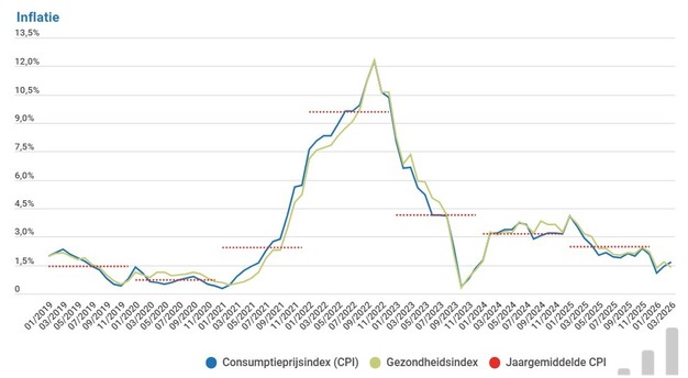 In maart 2026 steeg de inflatie in België naar 1,65 procent, ten opzichte van 1,45 procent in februari. De consumptieprijsindex (CPI) nam deze maand met 0,12 punt of 0,12 procent toe, bericht Statbel.
