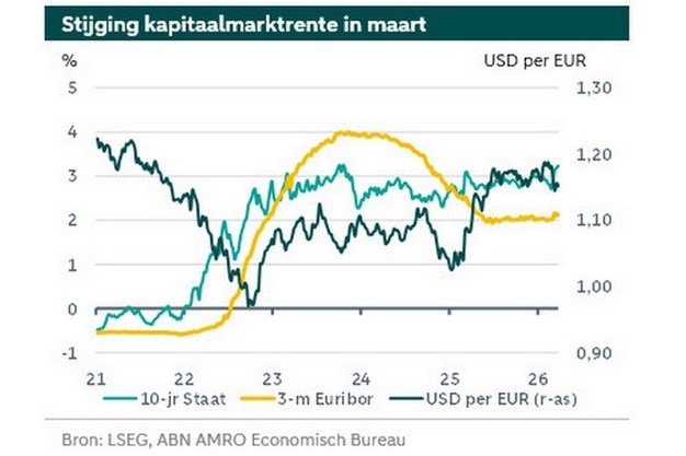 De Europese Centrale Bank (ECB) overweegt mogelijk twee renteverhogingen, wat leidt tot een stijging van de lange rente. Tegelijkertijd is de Amerikaanse dollar tijdelijk gestegen ten opzichte van de euro, schrijft ABN AMRO.