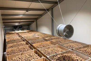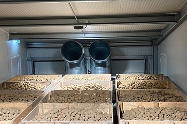 In ieder compartiment is een klimaatunit geplaatst met een koelvermogen van 50 kW. Deze units zorgen voor (mechanische) koeling, ventilatie en droging van het product. De installatie maakt gebruik van energiezuinige EC-ventilatoren en het natuurlijke koudemiddel R290 (propaan), dat een zeer lage milieubelasting heeft. Na het inschuren worden de aardappelen geleidelijk teruggekoeld van ongeveer 15°C naar 4°C of 7°C, naargelang de variëteit. Tijdens het inkoelen vindt er continu gecontroleerde ventilatie plaats om een stabiel bewaarklimaat te garanderen.
