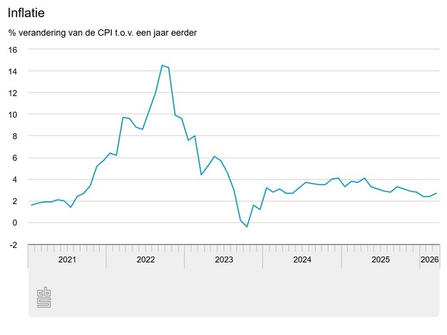 De inflatie in Nederland is in maart 2026 gestegen naar 2,7 procent op jaarbasis, tegenover 2,4 procent in februari. Dat meldt het Centraal Bureau voor de Statistiek (CBS). Ten opzichte van februari namen de prijzen met 0,7 procent toe.
