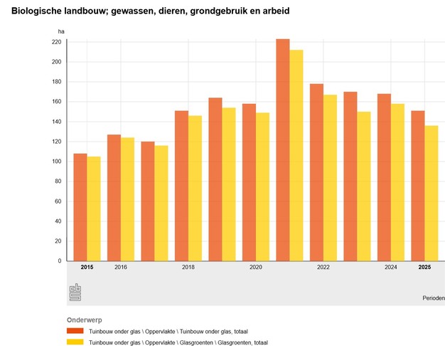 Het CBS telt 151 hectare biologische teelt onder glas in 2025. Dit blijkt uit definitieve cijfers van de Landbouwtelling van het Centraal Bureau voor de Statistiek (CBS). Het areaal daalt met 17 hectare ten opzichte van de telling uit 2024.
