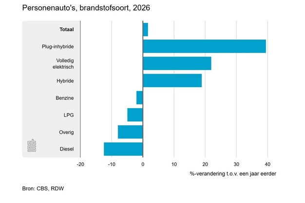 De groei van elektrische aandrijvingen gaat ten koste van traditionele brandstoffen. Vooral dieselauto's verliezen snel terrein, gevolgd door benzine en LPG. Deze daling zet al enkele jaren door en is in 2026 duidelijk zichtbaar in de samenstelling van het wagenpark.
