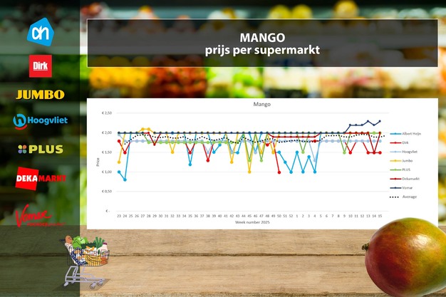 Mango laat bij vier van de zes gevolgde supermarkten stabiele prijzen zien. DekaMarkt verhoogt de prijs na een aanbieding weer naar €1,99. Vomar is de enige supermarkt met prijzen boven de 2 euro en neemt met een prijsverhoging van 10 cent verder afstand van de rest (€2,29). De gemiddelde weekprijs stijgt met 9 cent naar €1,93.