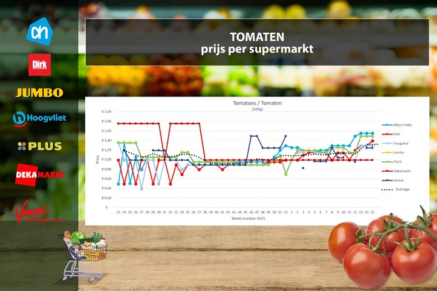 Prijsdata zijn afkomstig van Supermarktscanner.nl en gebaseerd op de online prijzen in de webwinkels van Albert Heijn, Jumbo, Plus, DekaMarkt, Dirk en Hoogvliet. De prijs is een gemiddelde, inclusief de promoties. In deze prijsvergelijking zijn herkomst en kwaliteit niet meegenomen. De meeste supermarkten vermelden deze gegevens niet op hun website. Jumbo verkoopt alleen verpakte trostomaten per 5 stuks in plaats van per 500 g of kilo.