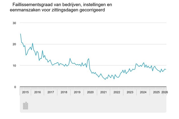 Het CBS benadrukt dat vooral de faillissementsgraad een beter en zuiverder beeld geeft van de ontwikkeling. Deze graad geeft het aantal faillissementen per 100.000 bedrijven weer en corrigeert daarmee voor veranderingen in het totaal aantal ondernemingen in Nederland, dat sterk kan fluctueren en per sector sterk verschilt. In maart kwam de faillissementsgraad uit op 8,1, tegenover 7,4 in dezelfde maand een jaar eerder. Daarmee ligt het niveau nog altijd ruim onder de piek van 24,8 in maart 2015, maar wel boven het laagterecord van 3,4 in augustus 2021. Na een periode van stijging richting 2024 stabiliseerde de faillissementsgraad, waarna sinds eind 2024 opnieuw een licht dalende trend zichtbaar is.