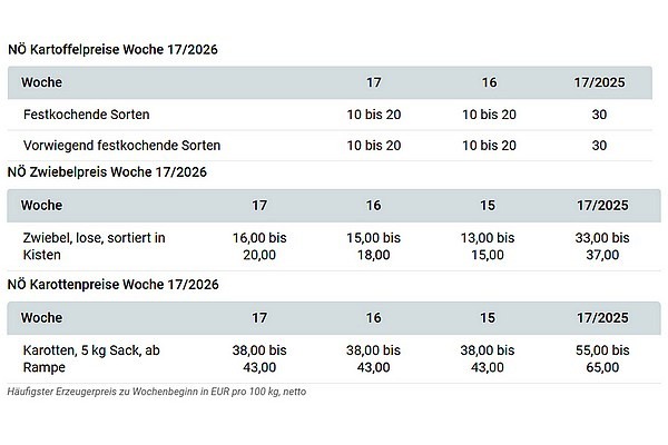 De telersprijzen blijven stabiel. In Neder-Oostenrijk wordt voor contractproducten en topkwaliteit nog altijd tot €20 per 100 kg betaald. Daarop worden wel nog kortingen toegepast voor risico, logistiek en exportmogelijkheden. Voor vrije producten liggen de prijzen duidelijk lager. In Opper-Oostenrijk bleef het prijsniveau onveranderd op €15 per 100 kg.