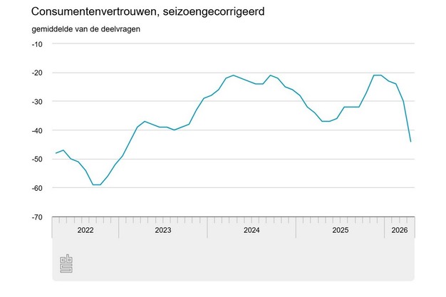 Het Nederlandse consumentenvertrouwen is in april fors gedaald, zo meldt het CBS. De indicator kwam uit op -44, tegenover -30 in maart. Daarmee is sprake van de op één na sterkste maandelijkse daling sinds de start van de meting in 1986. Alleen in april 2020, bij het begin van de coronapandemie, was de terugval groter.