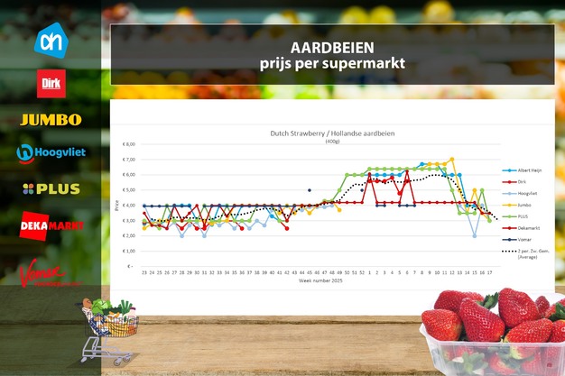 © Supermarktscanner De gemiddelde aardbeienprijs daalt spectaculair met 90 cent naar 3,09 euro per 400 gram. Bijna alle supermarkten voeren zeer scherpe aardbeienaanbiedingen die rond de 3 euro liggen, de laagste prijs van het jaar tot nu toe. Albert Heijn verlaagt met 1,00 euro naar 2,99 euro, evenals Hoogvliet. Jumbo verlaagt met 49 cent naar 3,00 euro en Plus met 2,00 euro naar 2,99 euro. DekaMarkt blijft stabiel op 3,49 euro. Vomar en Dirk ontbreken in de data, deze voeren online niet de 400 gram-variant van aardbeien