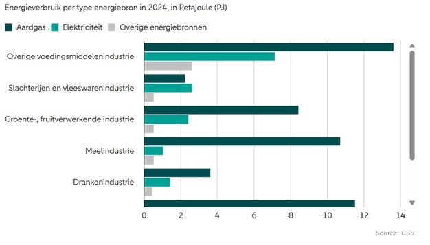 Het energieverbruik en de afhankelijkheid van aardgas verschillen per deelsector. Zo heeft de meelindustrie het aardgasverbruik met 24 procent verminderd in de periode 2021–2024, maar blijft deze sector voor 89 procent afhankelijk van aardgas. Slachterijen kennen een lagere afhankelijkheid van 42 procent en realiseerden een reductie van 9 procent in aardgasverbruik.